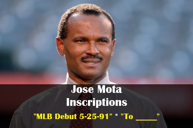 Jose Mota inscriptions (i.e. “MLB Debut 5-25-91” – “Go Angels” – “Go Dodgers” – “To __”)